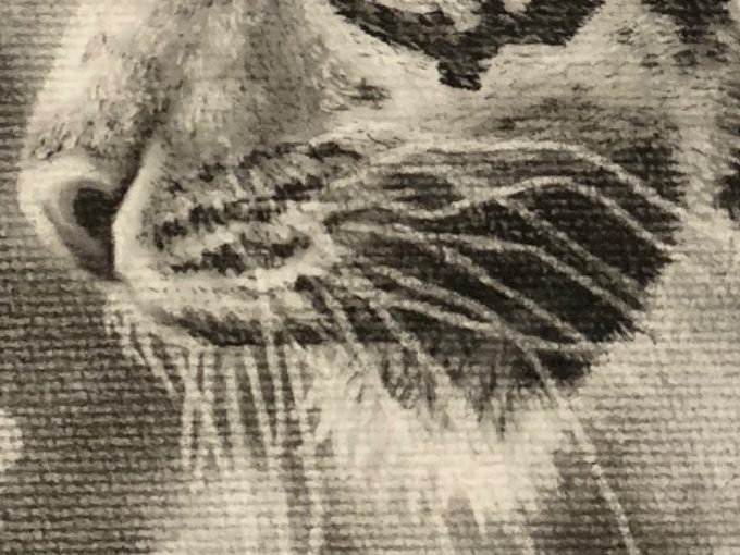 This charcoal painting captures a tiger moving through the scene, its posture calm and deliberate, its gaze relaxed yet focused. For this piece, I worked on watercolor paper for the first time, allowing the surface to enhance texture and depth.