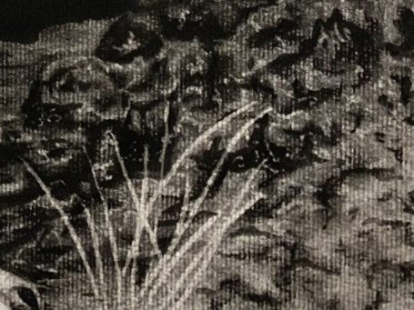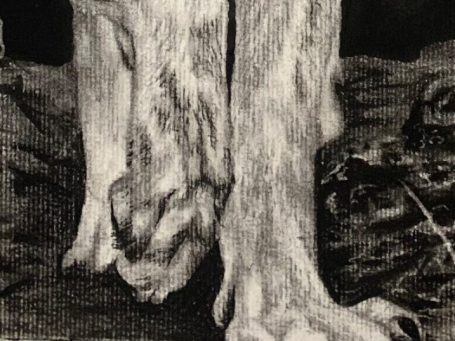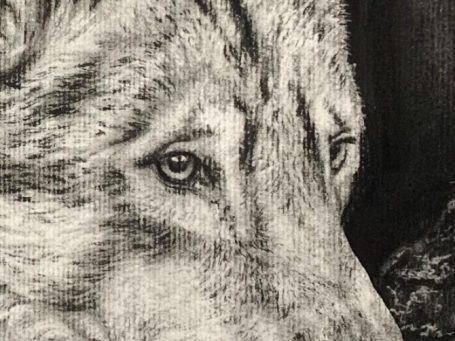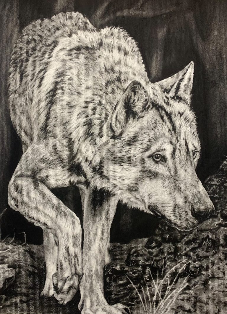 This charcoal painting captures a moment of focused motion: a wolf moving around a hill, its gaze fixed on something beyond the frame. The forward momentum of the body contrasts with the precision of its attention, creating a sense of quiet tension. For this piece, I experimented with charcoal on coarse watercolor paper and worked with liquid charcoal for the first time—a combination that introduced unexpected texture, depth, and expressive variation to the final outcome.